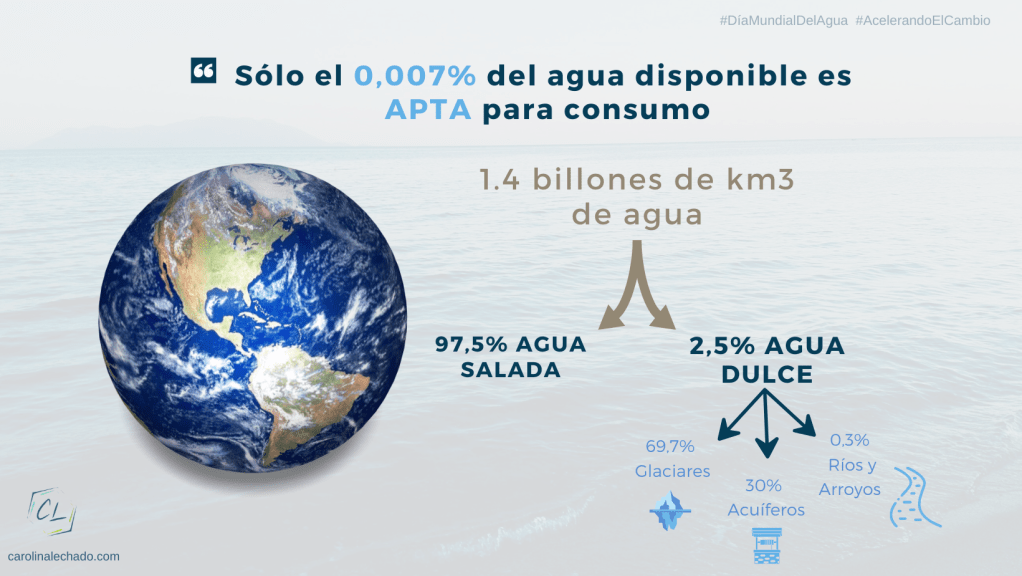 La cantidad de este oro líquido puede parecer mayor de lo que creemos en nuestro Planeta, llamado también el Planeta Azul. Pero en realidad, sólo el 0,007% del agua disponible en el planeta es apta para el Consumo Humano. El Planeta Tierra dispone de 1.4 billones de km3 de agua, de los cuáles el 97,5% es agua salda y el 2,5% agua dulce. De ese porcentaje de agua adulce, el 69,7% se encuentra el glaciares, el 30% en acuíferos y sólo el 0,3% es accesible a través de ríos y arroyos.